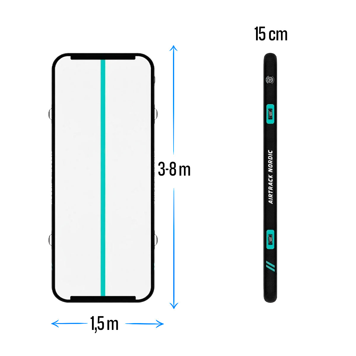 AirTrack Nordic Black är en specialdesignerad 15 cm tjock 1,5 meter bred AirTrack madrass som du kan välja mellan 3-6 meter. Svarta kolfiberliknande kanter och gula eller mint detaljer gör denna AirTrack snygg. I båda ändar har madrassen kardborrefäste med full bredd.