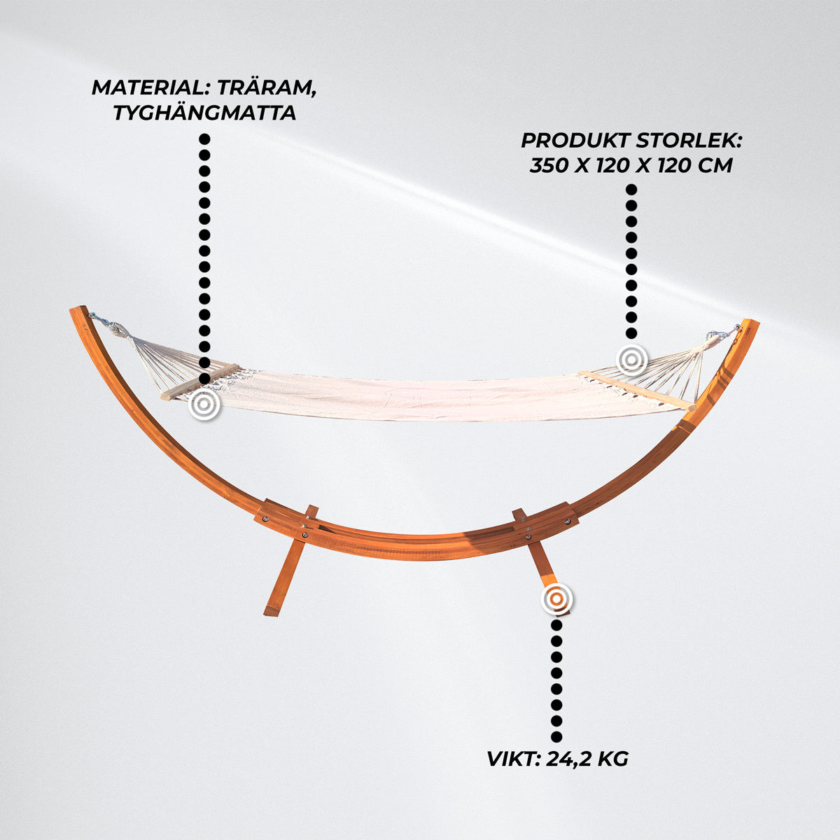 Lykke Hängmatta med stativ Premium är det självklara valet för dig som värdesätter komfort, säkerhet och elegant design. Den stabila träkonstruktionen ger pålitligt stöd, medan den mjuka tyghängmattan erbjuder en bekväm plats för långa stunder av avkoppling. Med en maximal belastning på 200 kg är den väl anpassad för de flesta vuxna användare.