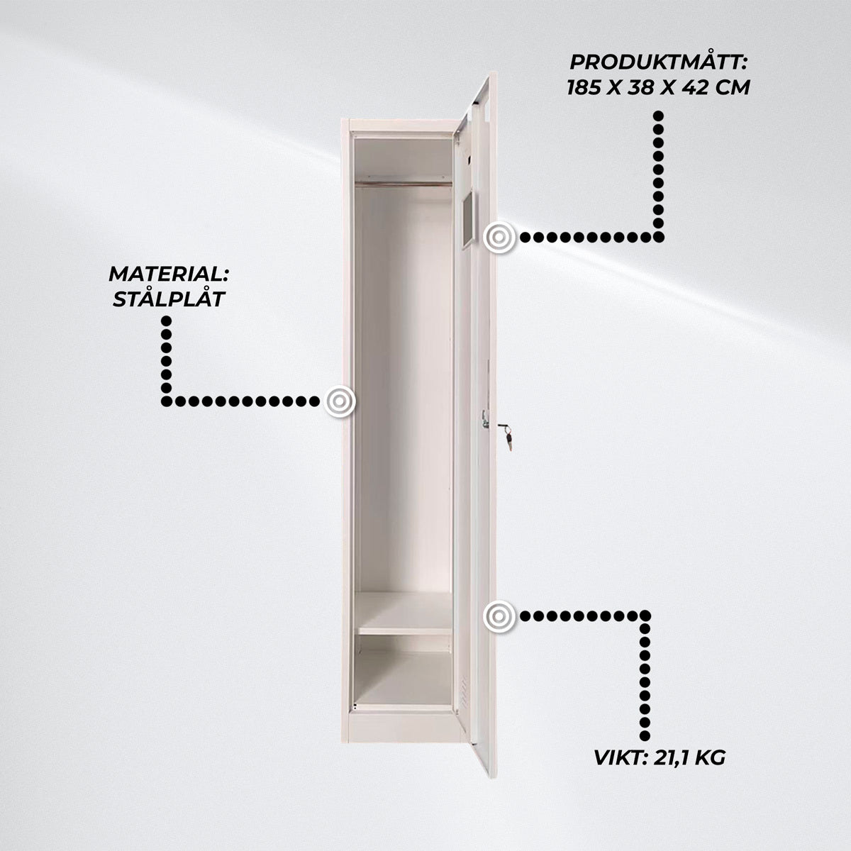 Upptäck Fornorth Klädskåp D100, den idealiska lösningen för att maximera din lagring med stil. Med sin slanka design och kompakta mått är detta klädskåp perfekt för trånga utrymmen där varje centimeter räknas. Tillverkat av högkvalitativt stålark, erbjuder det en hållbar och robust struktur som klarar både fukt och vatten, vilket gör skåpet perfekt för användning även i de mest krävande miljöer. Den enkeldörriga designen förstärker dess moderna utseende samtidigt som den bibehåller enkelheten och tillgängligheten.