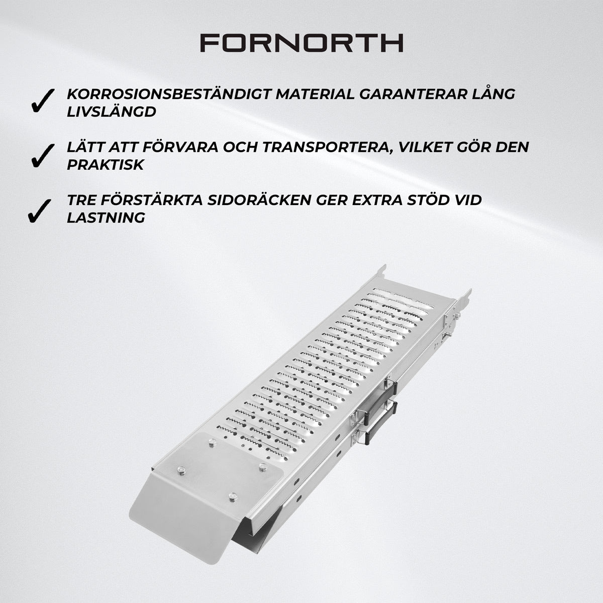 Fornorth Lastramp erbjuder överlägsna fördelar för privatpersoner och professionella användare. Dess hopfällbara design gör transport och förvaring enkel och bekymmersfri. Tillverkad av starkt galvaniserat stål, är rampen inte bara hållbar utan också resistens mot korrosion vilket garanterar en lång livstid. Med en maximal belastningskapacitet på 200 kg kan den hantera både tunga laster och daglig användning. Denna lastramp är inte bara mångsidig för lastning och lossning, utan även perfekt för alla praktiska behov i vardagen. Fornorth Lastramp är en tillförlitlig partner för att säkert och effektivt hantera dina transportbehov.