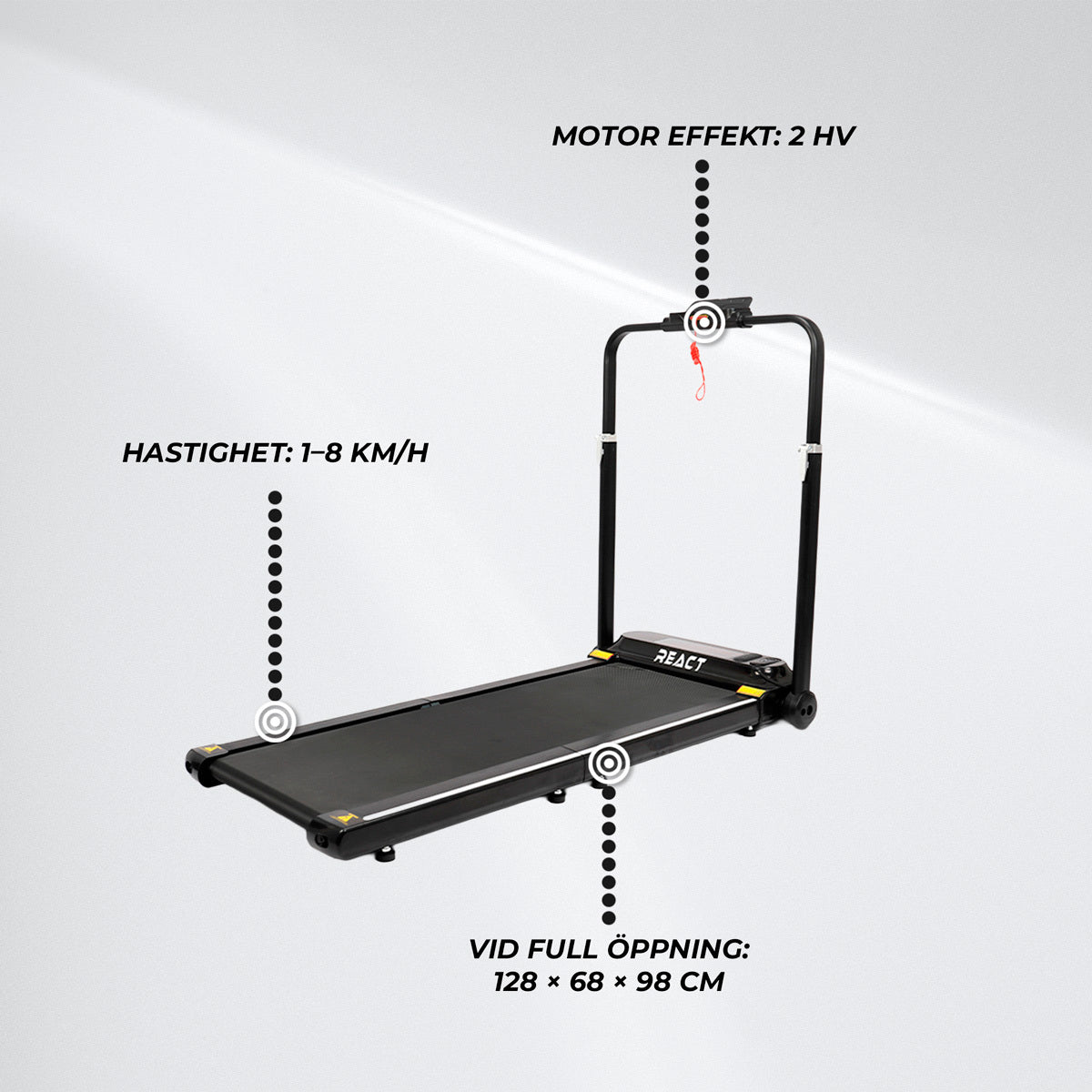 Söker du ett enkelt sätt att hålla dig aktiv hemma, även med begränsat utrymme? React Treadmill 2000 är din perfekta träningspartner. Med sin smarta, mittersta ihopvikbara design kan den vikas ned till endast 80x68x16 cm, vilket gör den idealisk för små lägenheter eller förvaring under sängen.