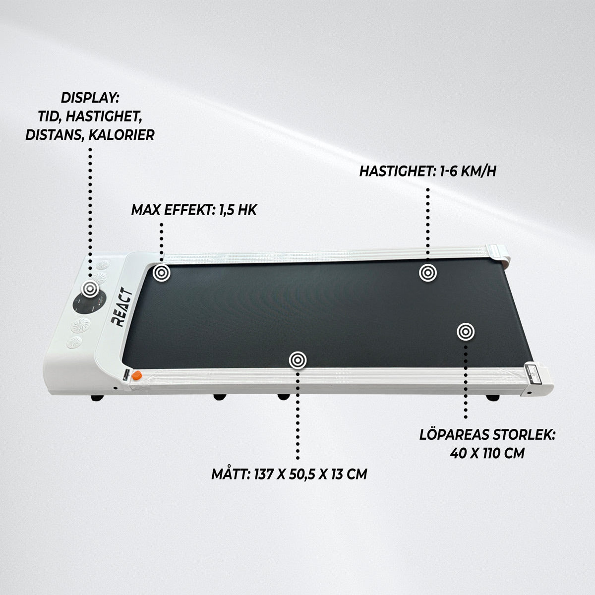 React Under Desk Gåband 1500 White erbjuder specifika fördelar som gör det till ett utmärkt val för dem som vill integrera mer rörelse i sin vardag. Dess kraftfulla 1,5 hästkrafters motor och justerbar hastighet ger en stabil och jämn gångupplevelse, anpassningsbar från 1 till 6 km/h, vilket gör det perfekt för både avslappnad promenad och mer energisk gång.