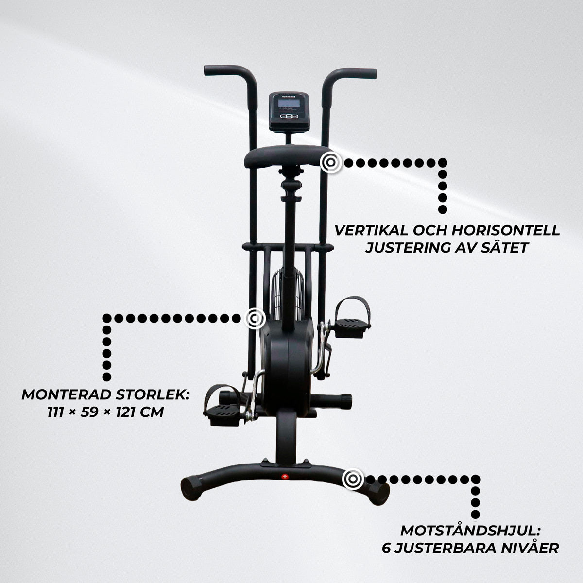 Intensiv och Effektiv: Tack vare den unika luftmotståndstekniken ökar intensiteten automatiskt med din ansträngning. Det här gör cykeln idealisk för både högintensiva intervallträningar och längre uthållighetspass.