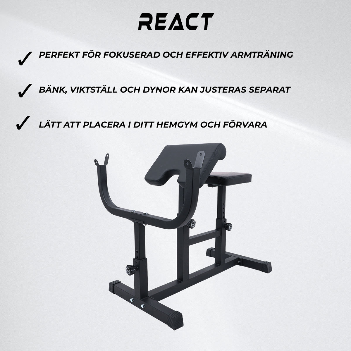 Tack vare dess stadiga konstruktion i stål ger bänken utmärkt stabilitet och kan belastas med upp till 200 kg, vilket ger dig tryggheten att våga utmana dig själv i din träning. Med en kompakt storlek och praktisk justerbarhet är React Curlbänk 100 en pålitlig och utrymmeseffektiv tillägg till varje hemmagym. Investerar du i React Curlbänk 100, investerar du i din egen träningsframgång och långsiktighet.
