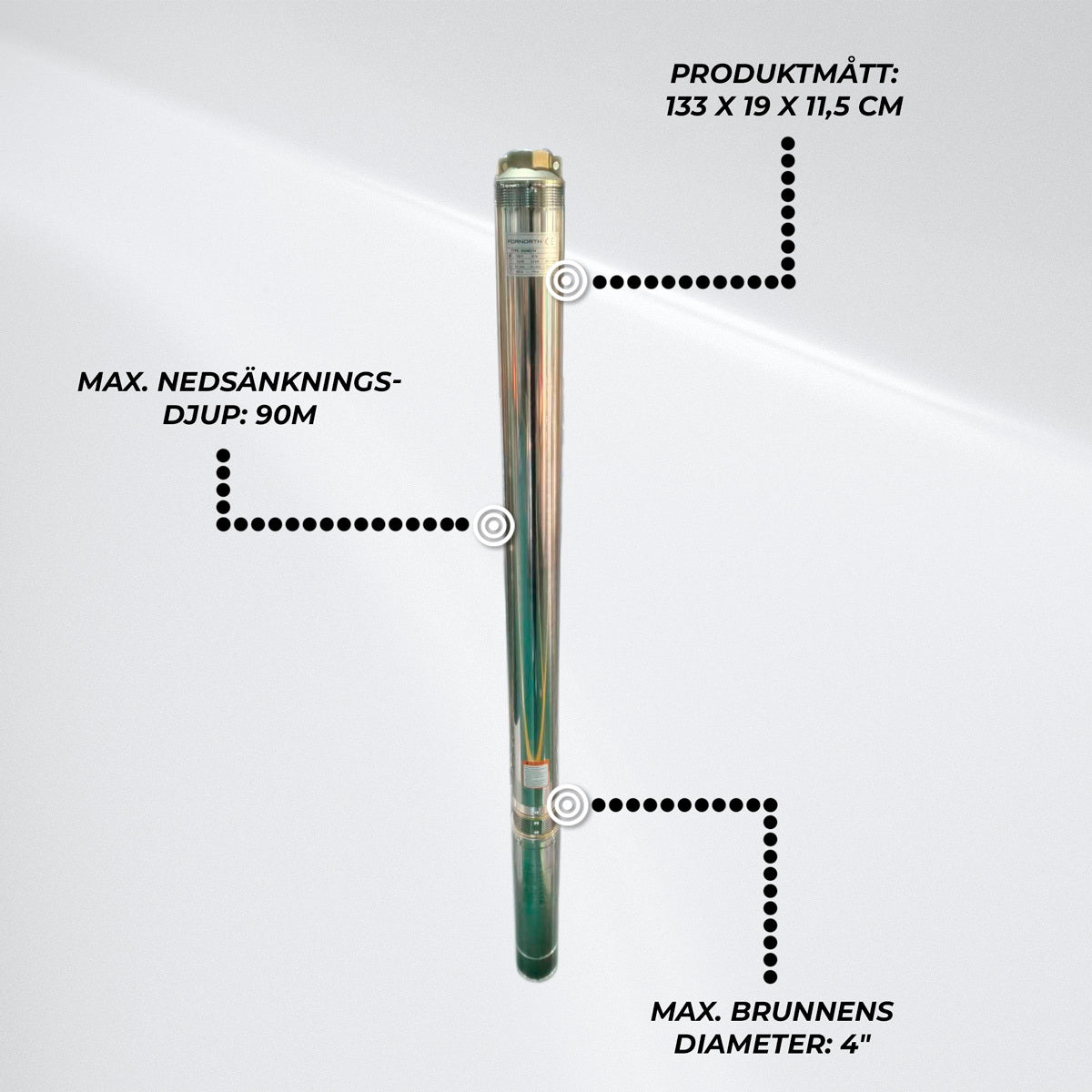 Pålitliga driftsförhållanden: Hanterar en maximal vätsketemperatur på +35°C och fungerar effektivt med en maximal sandhalt på 0,25%. Kan försänkas upp till 90 meter, perfekt för djupa brunnar med diametrar upp till 4 tum.
