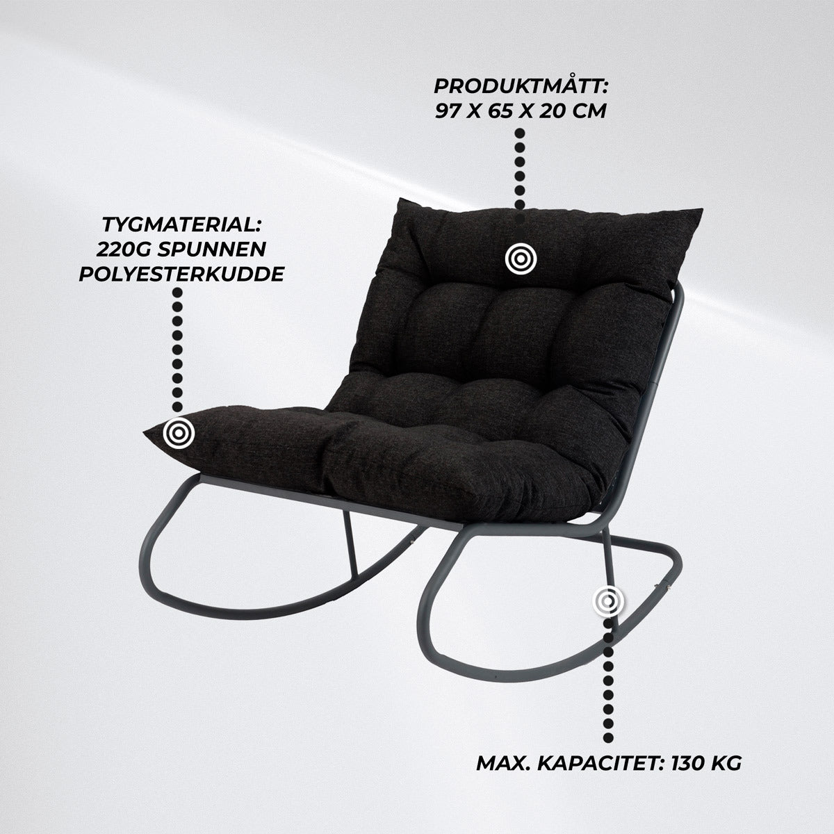 Upptäck den ultimata komforten och modern design med Lykke Gungstol Fjord, svart. Denna eleganta gungstol kombinerar tidlös design med modern funktionalitet. Den robusta stålramen och de hållbara, väderbeständiga kuddarna i spunnen polyester säkerställer att din gungstol står emot de variabla klimatförhållandena och behåller sin skönhet och komfort år efter år. Vare sig det är för lugna stunder på altanen eller som ett stilfullt tillskott till ditt vardagsrum, erbjuder Lykke Gungstol Fjord den perfekta balansen mellan form och funktion. Montera enkelt och börja njut av ditt nya favorittillhåll!